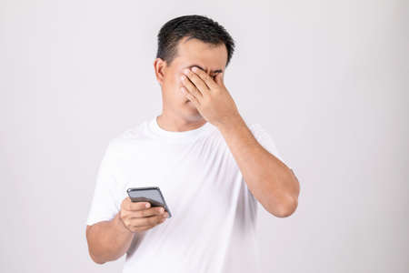 Eyestrain concept. Man touching his eyes because pain or hurt after using too much smartphone. Studio shot isolated on grey background