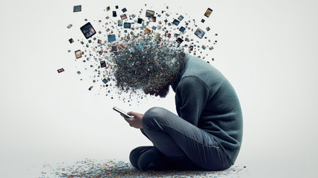 An artistic depiction of a person overwhelmed by digital content sitting in reflection with a cloud of images exploding from their head exploring modern life.
