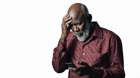 A man with a beard looking at his cell phone, AI