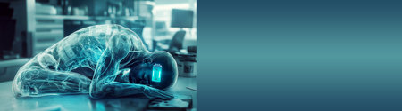 A tired person sits with slumped shoulders, symbolizing low energy and burnout. A fading battery icon hovers above, emphasizing exhaustion and stress. banner design includes ample copy space.