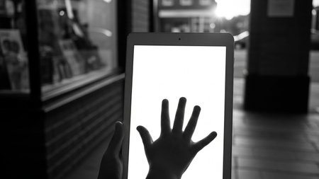 Silhouette of a woman using a tablet computer in the city