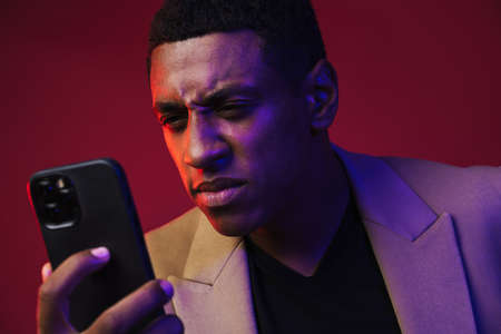 Young black man dressed in jacket frowning while using cellphone isolated over red wall
