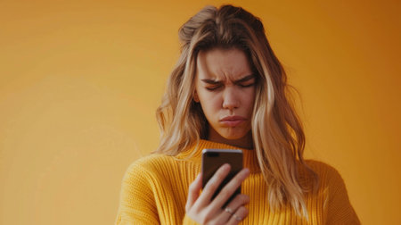 Young woman in yellow sweater texting on phone against vibrant orange background