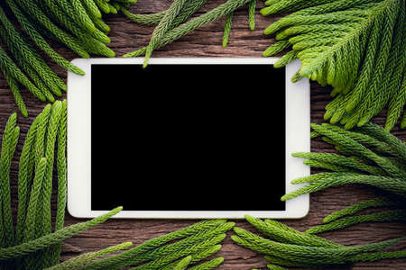 wood table with blank screen on tablet over leaves border frame. view from top table.