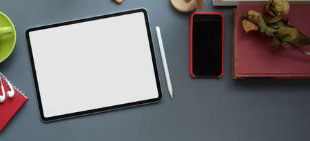 Simple grey workspace background with digital portable tablet white screen for display your banner mockup with accessories. top view