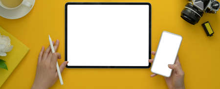 Overhead shot of female photographer working on mock-up digital devices, camera and other supplies on creative workspace