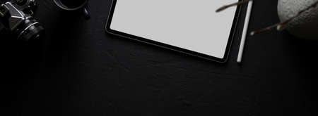 Top view of dark modern workspace with mock-up tablet, camera, decorations and copy space on black desk
