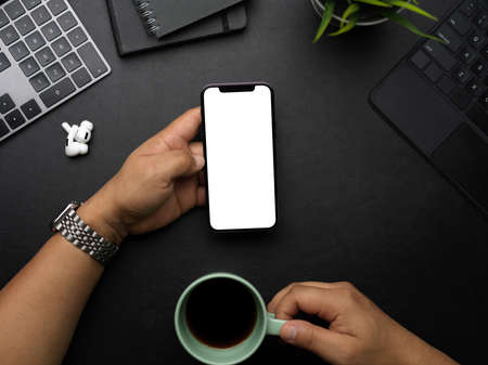 Male freelancer reading business trends on electronic news via smartphone while drinking coffee, phone blank screen mockup, hold coffee, black modern workspace