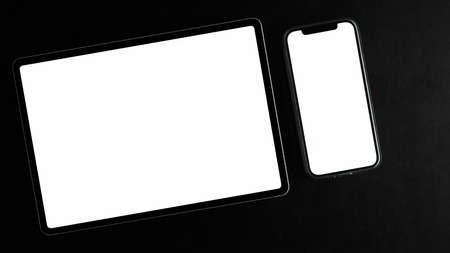 Digital tablet computer or touchpad and smartphone blank screen mockup on black background. top view