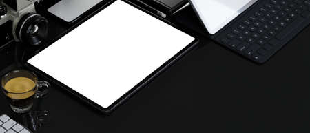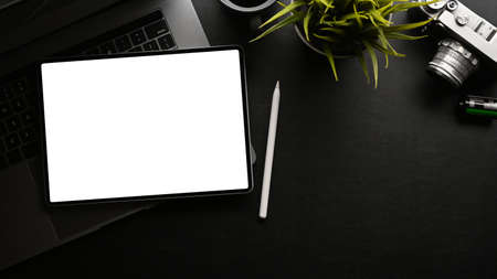 Hipster dark office desk workspace with digital tablet touchpad white screen mockup, pen, camera, and accessories. top view, flat lay