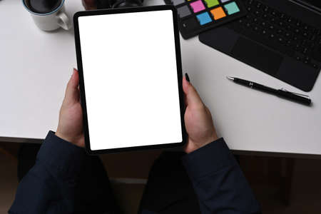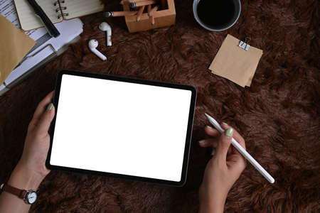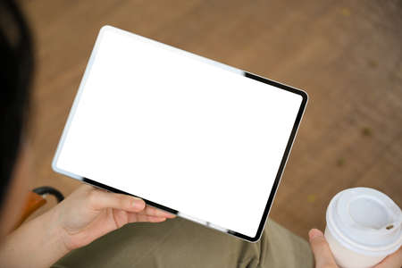 Close-up image, A digital tablet touchpad white screen mockup in a women's hand. Female using tablet at the coffee shop.