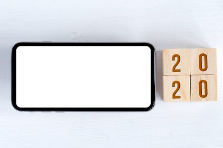 Mock up of smartphone and wooden cubes with numbers symbolizing new year 2020 on white background.