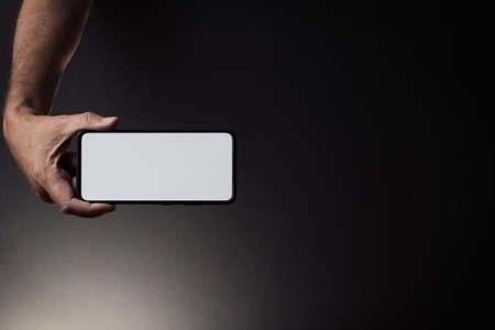 Colour image of man's hand holding black smartphone horizontally with blank white screen isolated on dark background with dramatic lighting and copy space to side