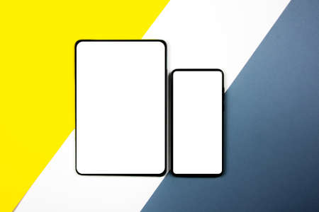 Mock up of a smartphone and a tablet on different colored backgrounds.