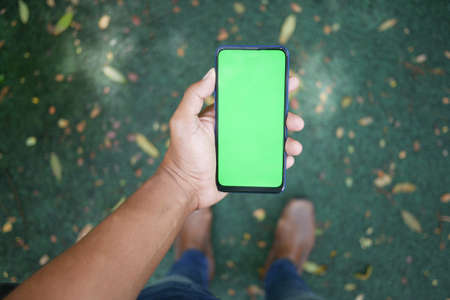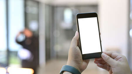 Mockup screen of a modern smartphone in a male or adult man's hands over an office table. Close-up