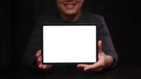Young man holds a touch pad tablet on isolated white background. Large-size digital tablet with white screen is held by the man on the blurred backround. A touch pad in man's hands on the foreground
