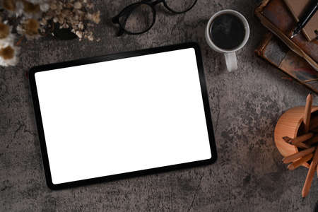 Top view, a digital portable tablet computer white screen mockup on modern dark workspace.