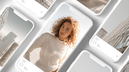 Various smartphones showcase engaging stories and lively short video clips, reflecting individual experiences and creativity in social media.