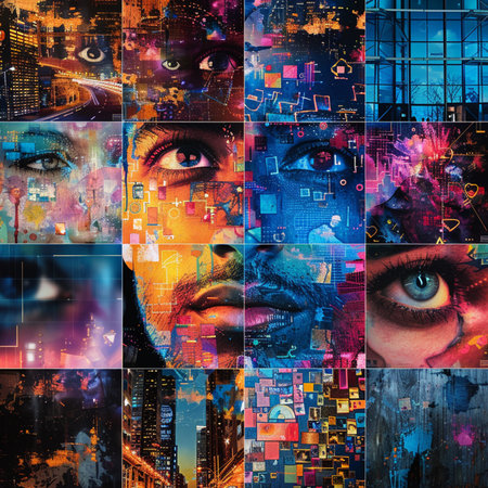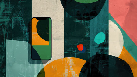 Minimalistic mixed media collage showcasing technology and vibrant textures in harmonious design