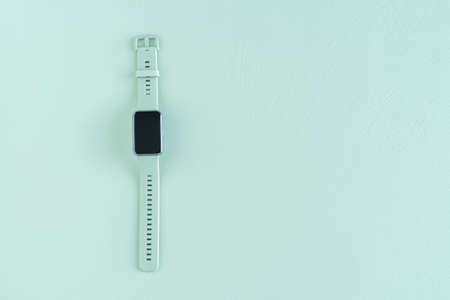 Green smart watch on green background. Copy space. Topview.