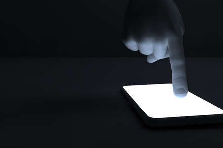 3D illustration or 3D rendering - view of hand man finger tapping smart-phone with white light in dark space or room - technology concept