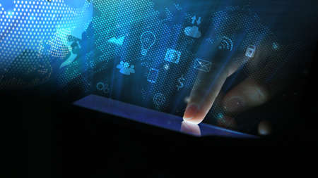 Finger touching tablet with dark background with copyspace