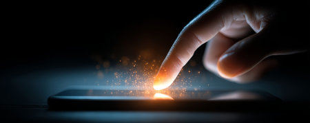 Finger touching smartphone screen with glowing light and spark particles dark background, technology concept with warm light