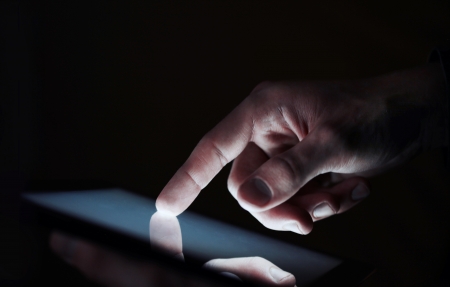 dark background, finger, tablet.