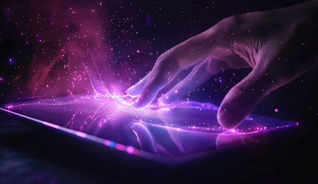 Hand touching a glowing tablet, emitting colorful sparks and cosmic particles, set against a dark, starry background