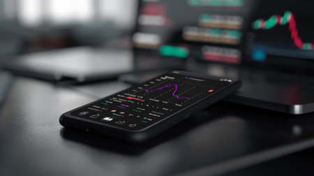 A smartphone displays vibrant investment analytics while placed on a minimalist desk. Surrounding digital screens show stock market data, highlighting market fluctuations in real-time.
