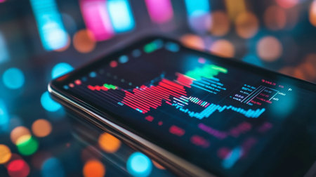 Close-up view of a mobile device displaying vibrant financial data. The visual representation features colorful charts and statistics amidst a blurred background.