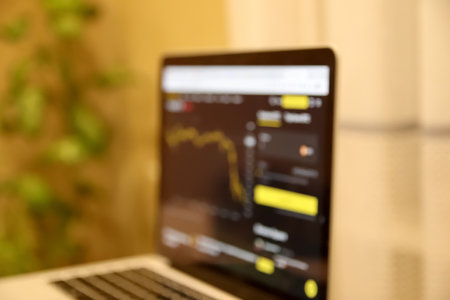 Stock exchange trading concept with blurred background. Blurred background. Laptop on trading desk with defocused graphics. Out of focus.