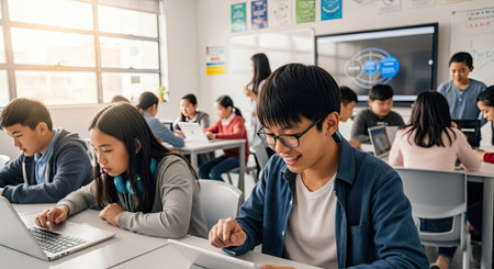 group of young asian high school students using laptop computer in classroom