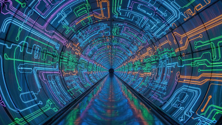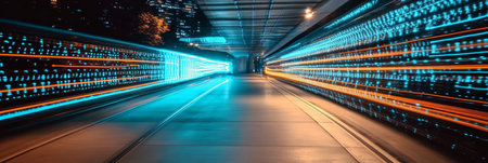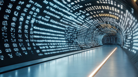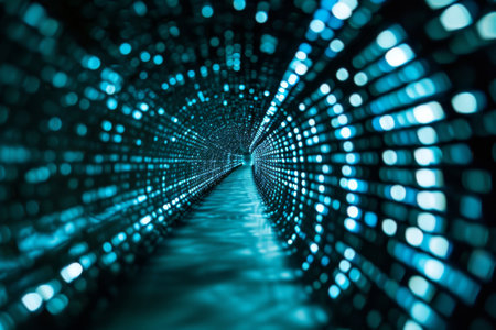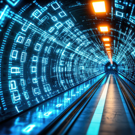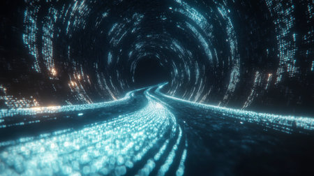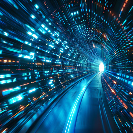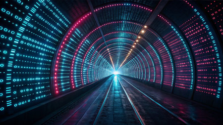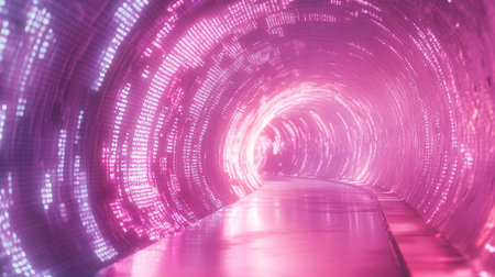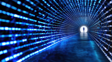 A digital tunnel with glowing lights creates futuristic atmosphere