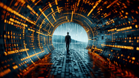 Man Walking Through Digital Tunnel of Data, Cyber Future Concept.