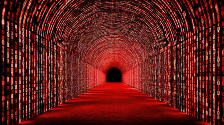 Digital tunnel filled with binary code creates striking visual effect, evoking sense of mystery and technology. vibrant red colors enhance atmosphere, suggesting futuristic or cybernetic theme