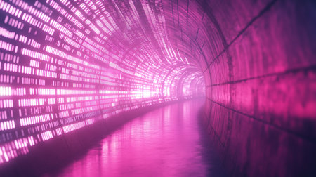 A mesmerizing neon-lit tunnel with purple and pink hues, the lights bending and flowing along the walls in a futuristic pattern.