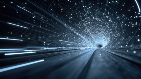 Discover a mesmerizing digital tunnel filled with glowing particles and dynamic light streaks. This captivating image evokes speed and motion in a surreal, dark space.