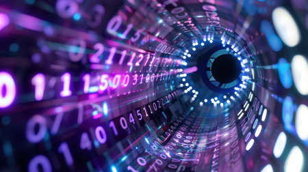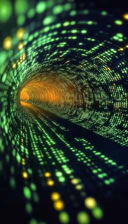 A captivating abstract image of a digital tunnel filled with glowing binary code, showcasing vibrant colors and visual effects that symbolize technology and data flow.