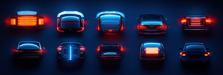 Various LED automotive lights are artistically placed on a dark surface, showing vibrant colors and designs suitable for customization.