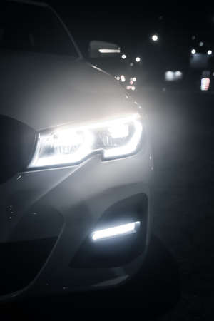 Glowing Headlight of a modern car close-up