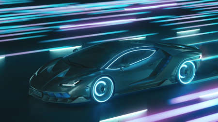 3d render Sports cyber neon car rushes along the night road with neon lights at high speed
