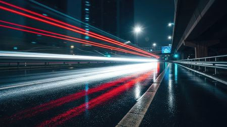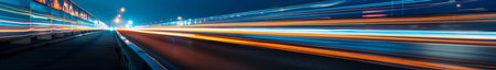 Experience the thrill of a night drive with vibrant light trails capturing the dynamic motion and energy of the urban landscape from a unique perspective.
