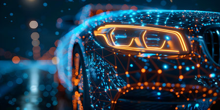 digital car made of glowing 3d triangular polygons on a glossy surface with reflection