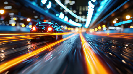 A striking visual capturing the exhilarating sensation of speed as a sleek black car races down a city road at night, surrounded by vibrant lights.