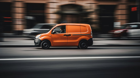 Modern small delivery shipment cargo courier van moving fast on motorway road to city urban suburb. Busines distribution and logistics express service. Mini bus driving on highway on sunny day. AI generated