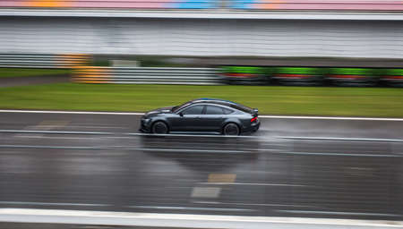 Black modern design sport coupe driving in rainy road