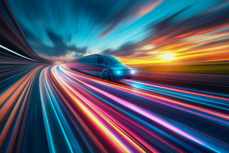 Sport car driving at high speed on highway, creating dynamic light trails and vibrant energy under evening sky.