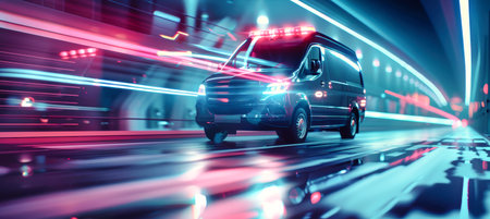 A modern ambulance, bathed in blue neon light, races through a city at night. The flashing lights and speed lines create a dynamic sense of urgency.