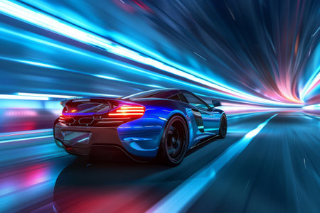 Sleek Car in Motion with Vibrant Light Trails Capturing the Essence of Speed and Modern Technology Against a Dark Background for Stock Photography